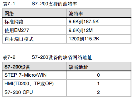 表7--1中列出了S7--200支持的波特率。
