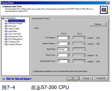 9.6 kbaud,网络地址的缺省设置为2。如图7--4所示,使用STEP 7--Micro/WIN为S7--200设